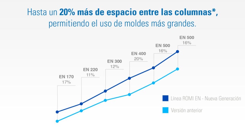 Con las nuevas dimensiones de la unidad de cierre, las máquinas de la Nueva Generación tienen una superficie de molde mayor, el aumento de hasta un 20% en el espacio entre columnas (con excepción de la ROMI EN 70 y ROMI EN 100) permite la utilización de moldes más grandes, compatibles con el tonelado de la máquina.